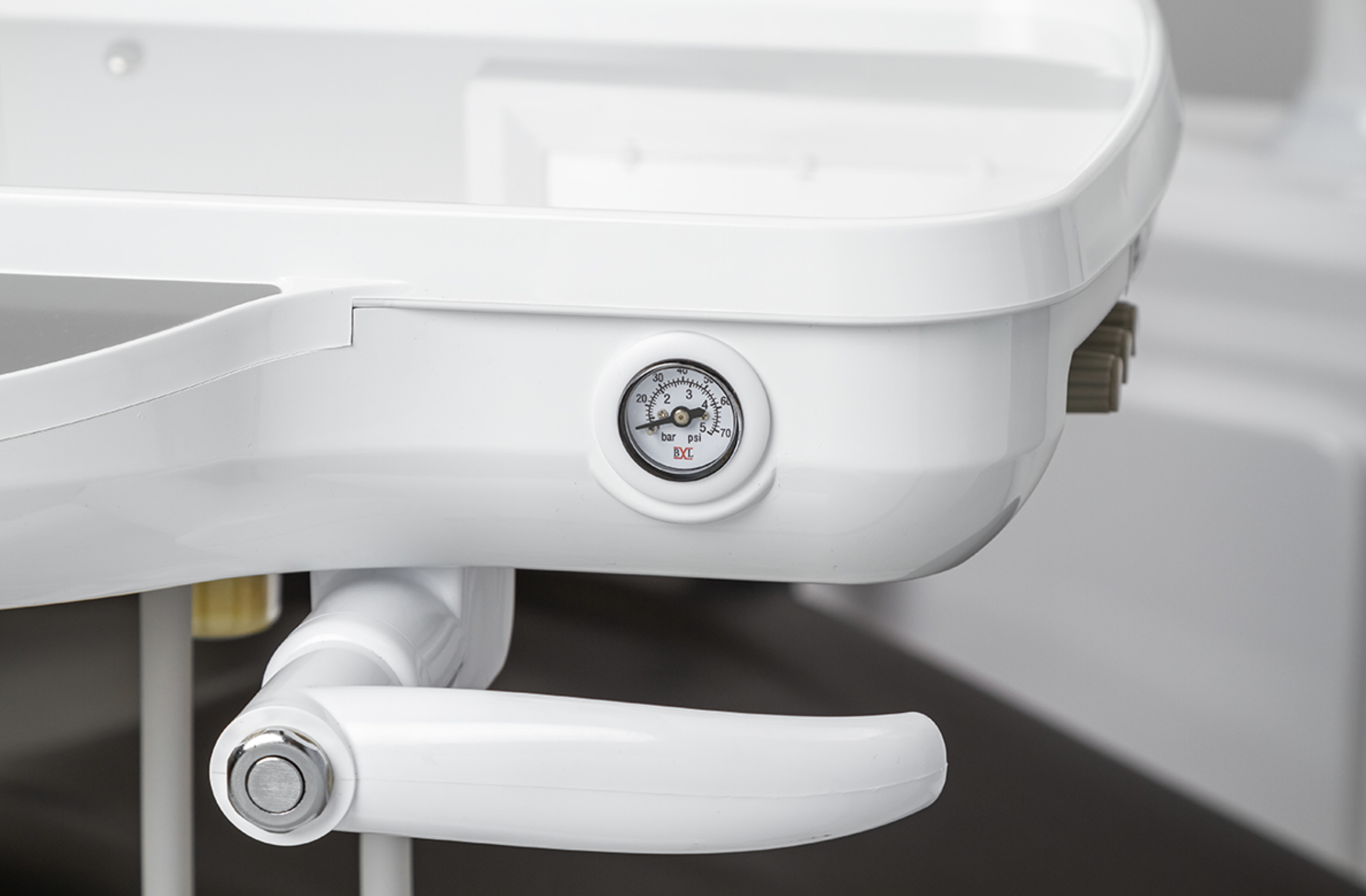 Блок врача предполагает нижнюю подачу инструментов, оснащенных четырьмя выходами М4 и пистолет для подачи воздушно-водяной смеси. Нижняя подача инструментов популярная у стоматологов, которые предпочитают не тянуться за инструментом через пациента и не бороться с силой натяжения пружины. Также блок врача оборудован специальным сенсорным блоком управления (креслом, гидроблоком и другими инструментами), оснащен манометром давления. Также имеется пантограф с пневмотормозом рабочего положения. Приятным преимуществом является наличие негатоскопа для просмотра рентгеновских снимков.