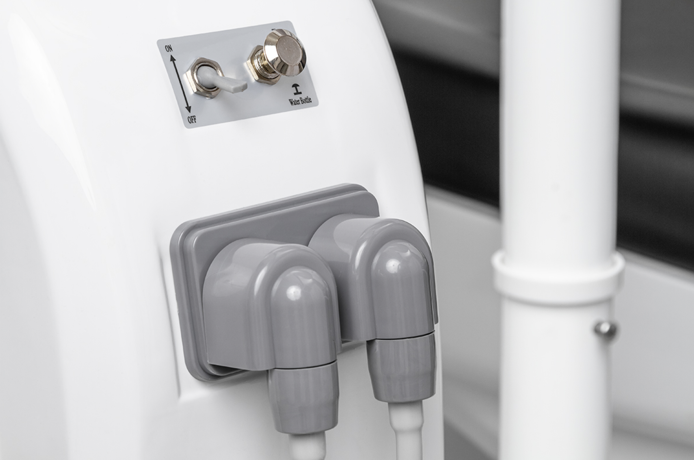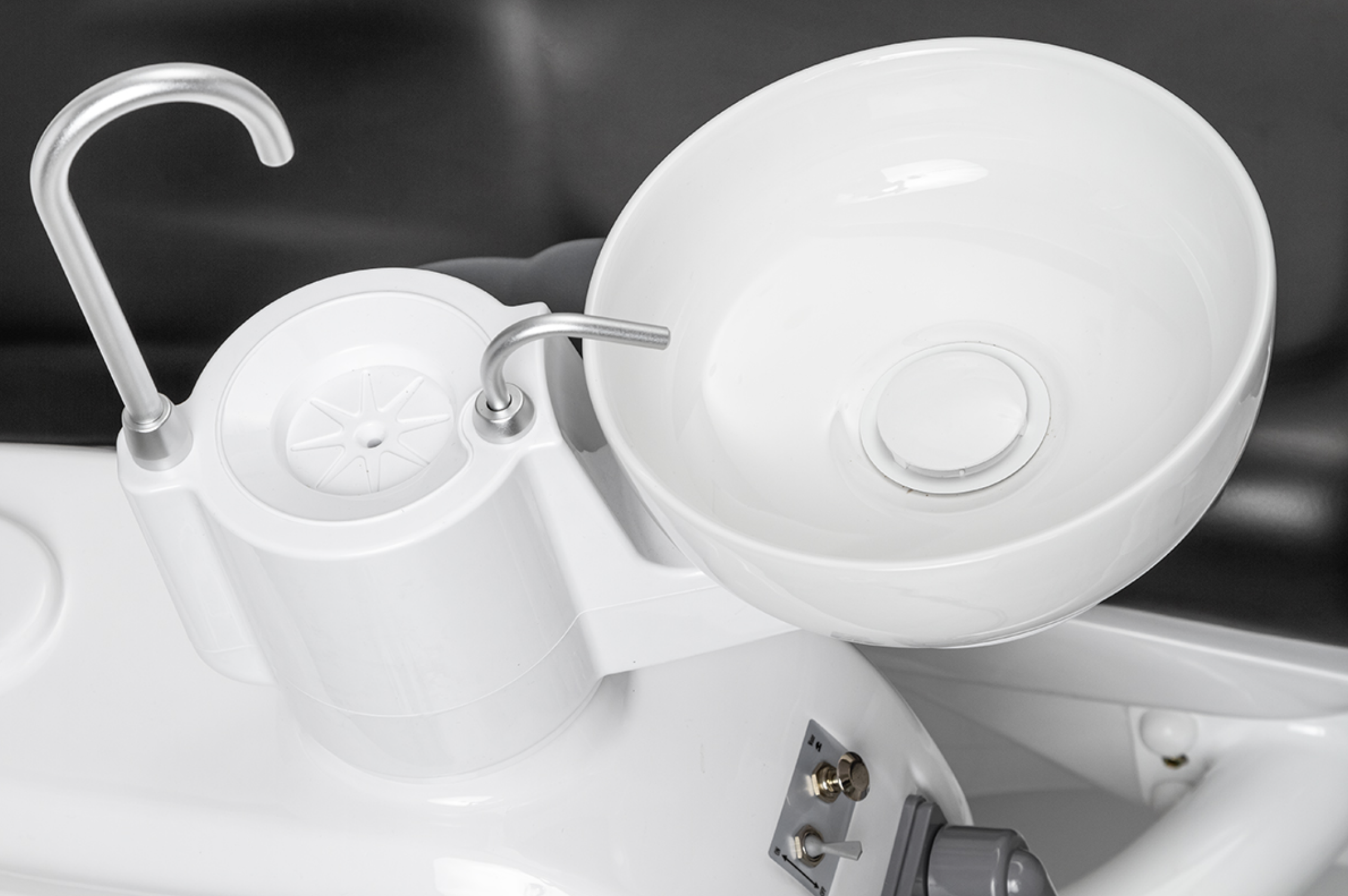 Модуль ассистента рассчитан на четыре инструмента, в базовой комплектации оснащен пылесосом и слюноотсосом. В эжекторный гидроблок встроена емкость для дистиллированной воды, которая подается под давлением. Плевательница поворотная, угол 70 градусов, частично выполнена из фарфора , есть функция автоматического омывания чаши и наполнения стакана.