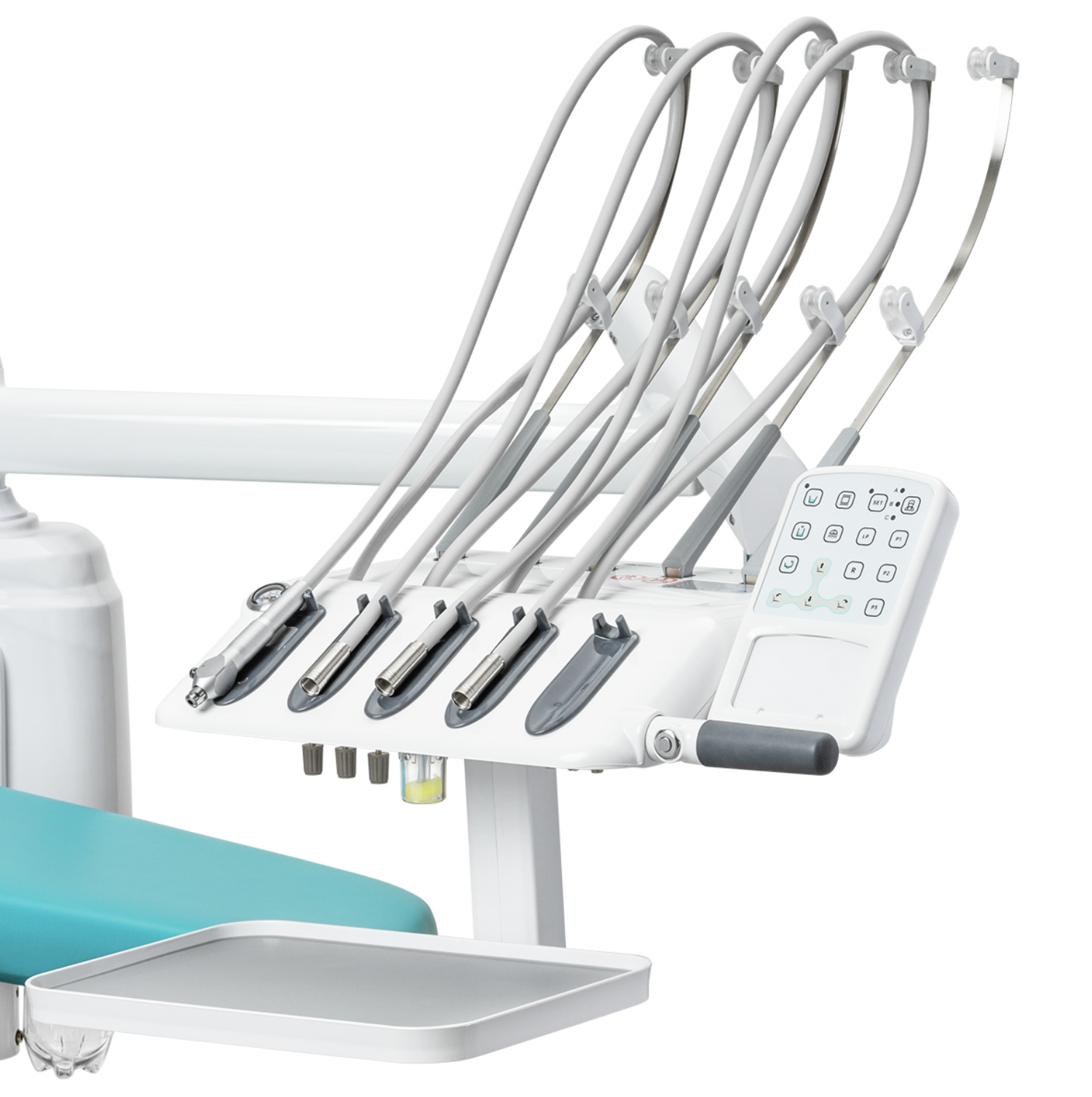Установка AY-A 1000 оборудована блоком с верхней подачей инструментов, которая очень популярна у стоматологов, так как дает возможность комфортно работать. Инструменты всегда под рукой, за ними не нужно поворачиваться, к тому же соединительные шланги висят достаточно высоко и не мешаются под ногами. Блок врача с 5 инструментами предоставляет широкие возможности для работы. Также специально для врача у блока предусмотрена возможность настраивать кресло индивидуально для врача. Всего можно сохранить до трех таких настоек.