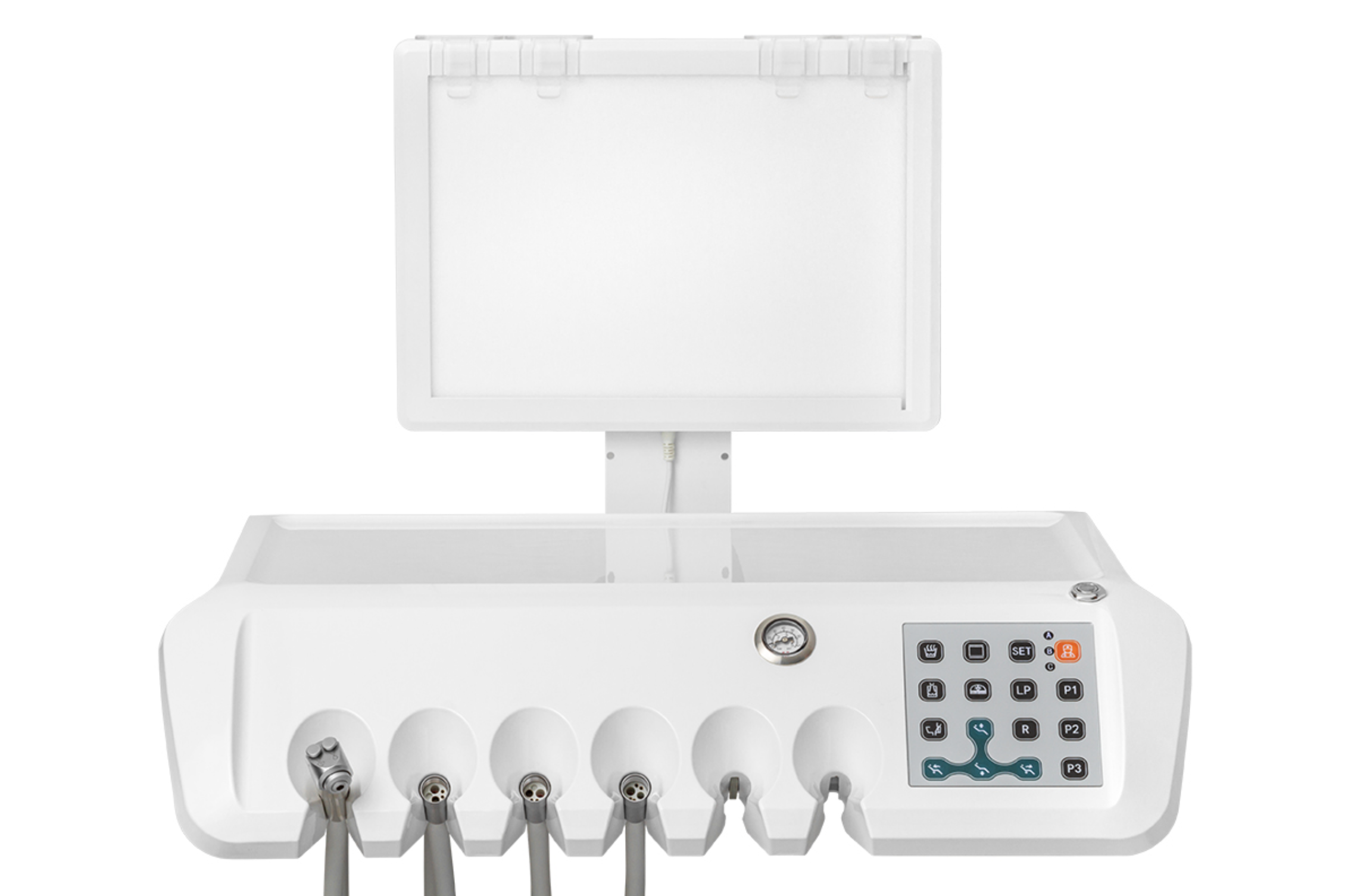 - Модуль ассистента на 4 инструмента с пылесосом и слюноотсосом (шланги с увеличенным просветом для использования с хирургической помпой).
