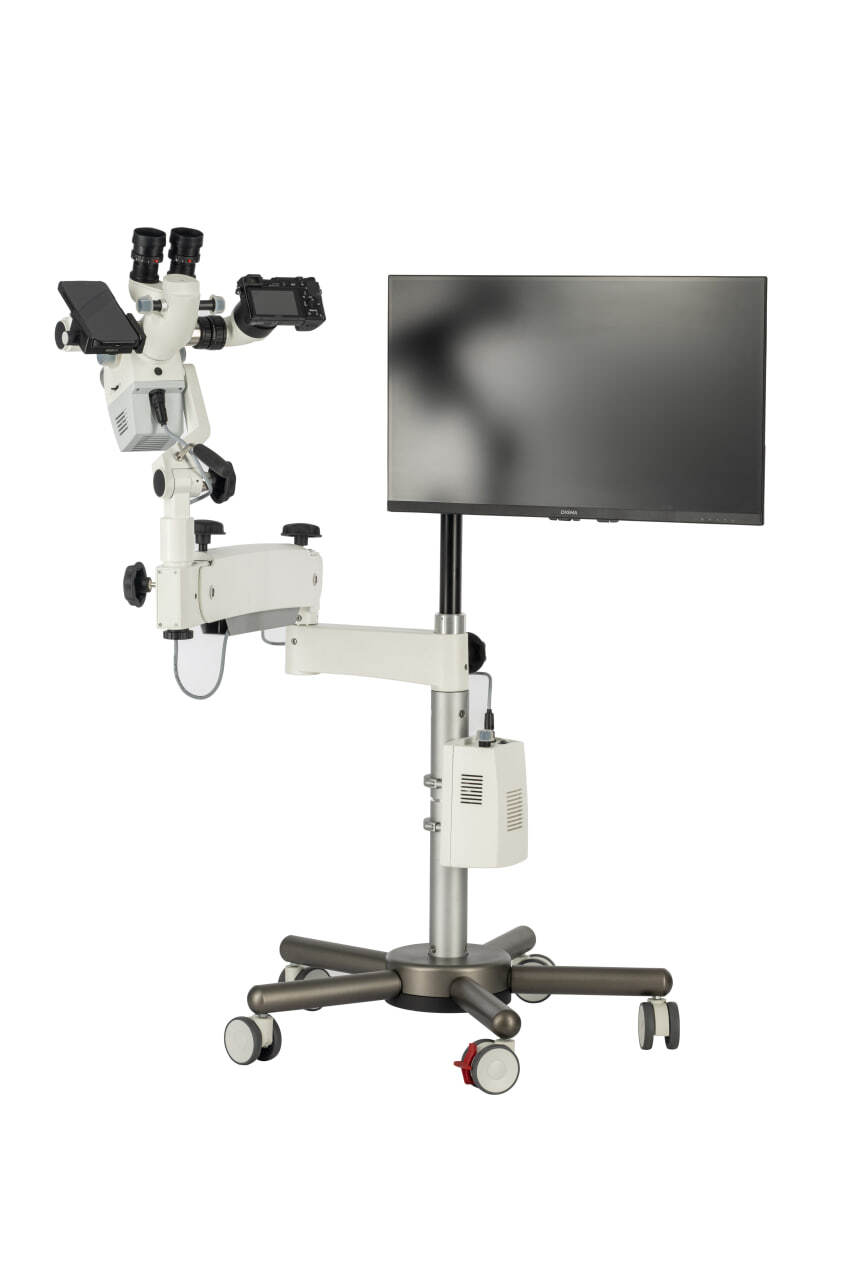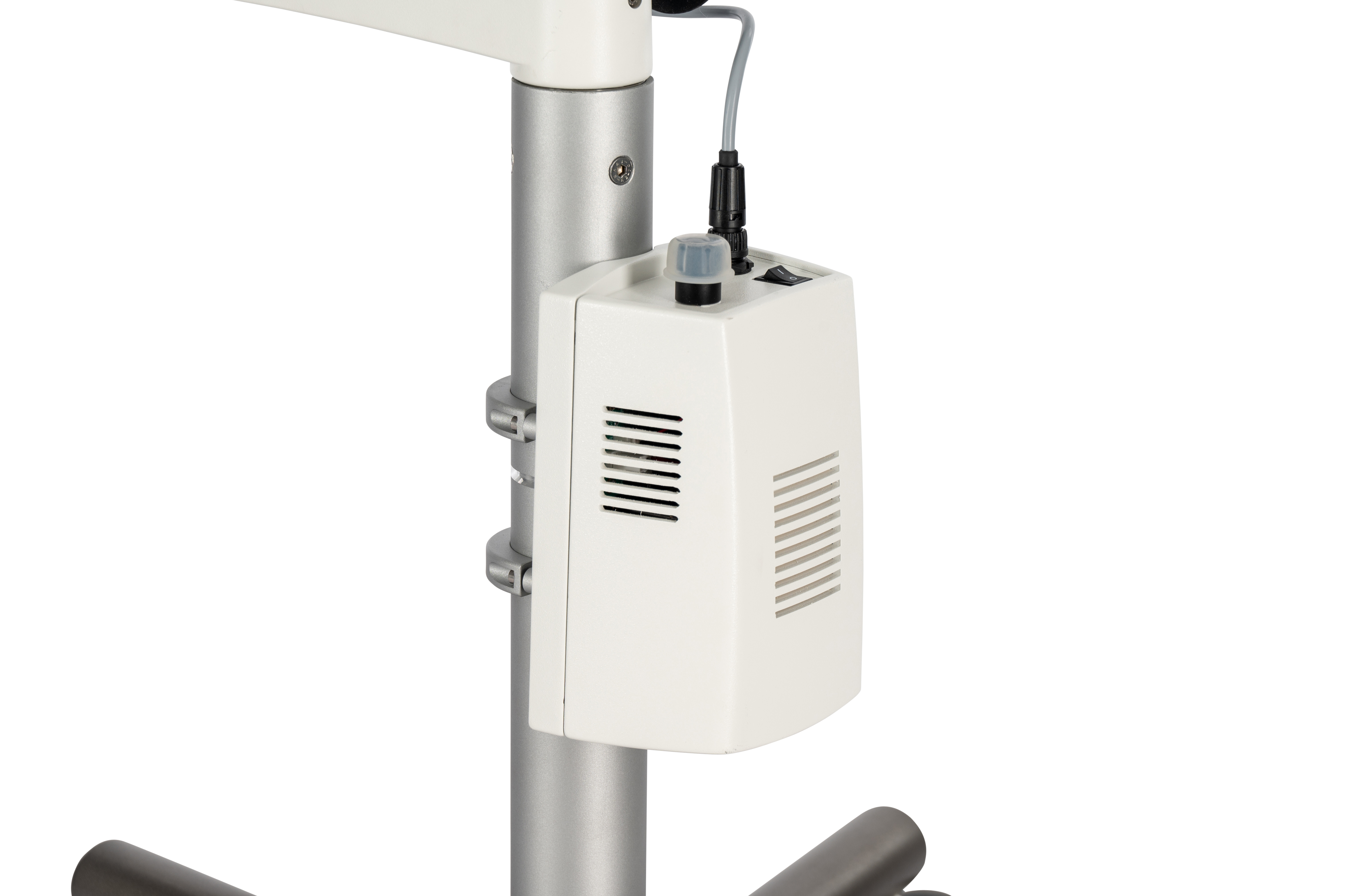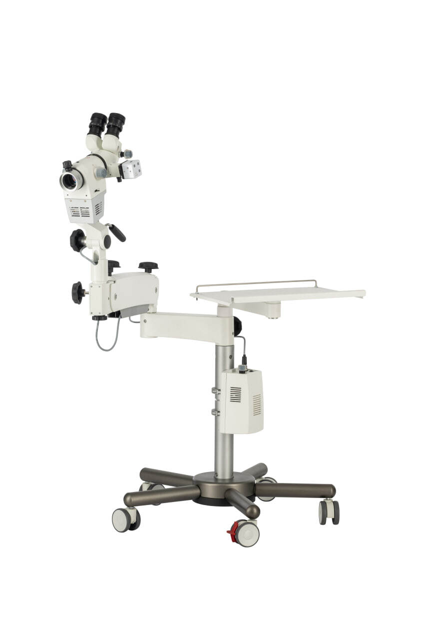 Консольный штатив для свободного позиционирования плеча и оптической головы в рабочей зоне. Возможность регулировки положения оптической головы и бинокулярный тубус 45° позволяют подстраиваться под любые виды манипуляций для комфортной работы врача. Мобильное пятилучевое основание. 5 колёс с системой фиксации для обеспечения более стабильного положения прибора при исследовании.