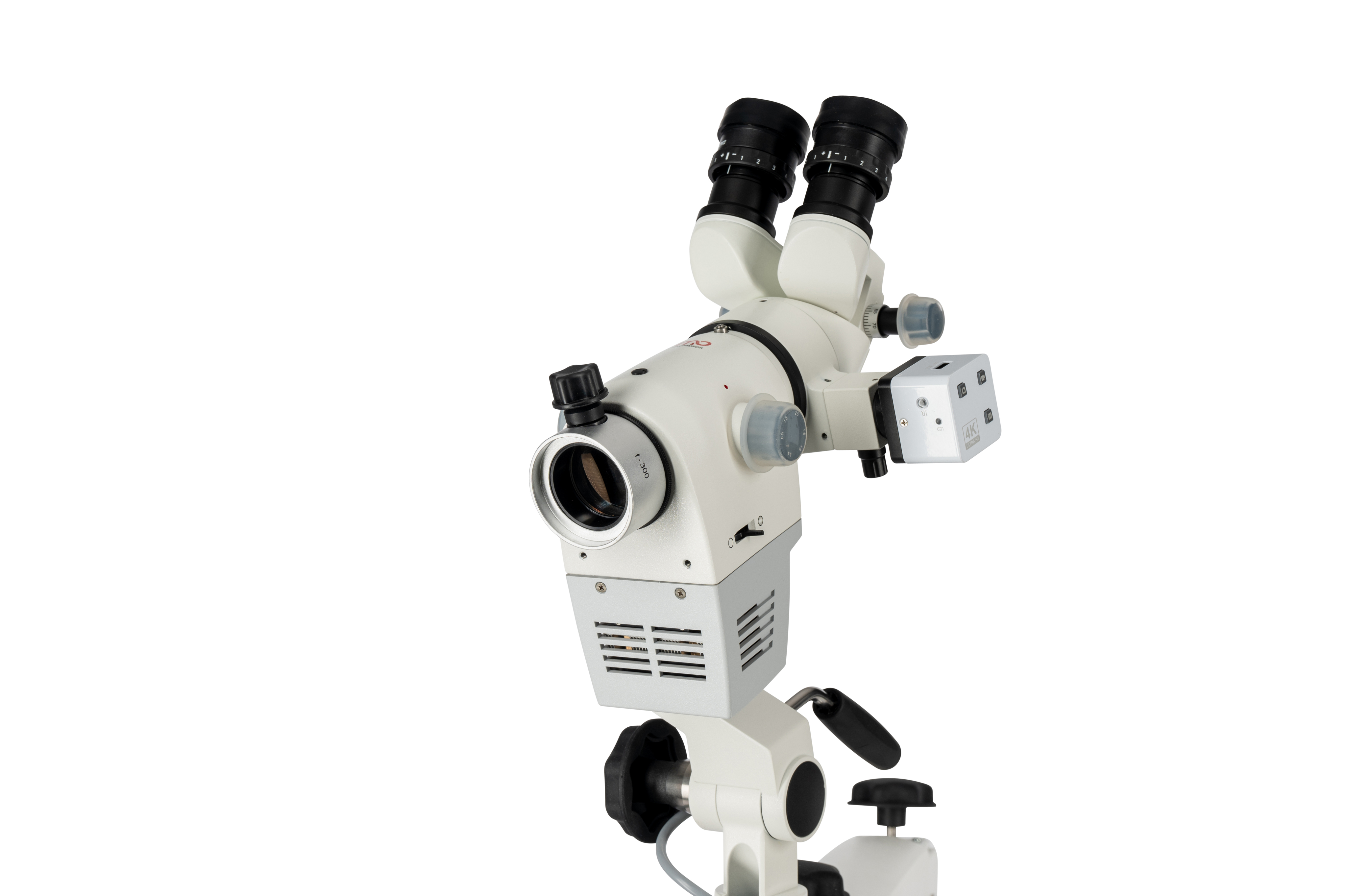 Апохроматическая оптическая система с пятиступенчатым увеличением. Ручки управления слева и справа на оптической голове. Защищены автоклавируемыми колпачками.