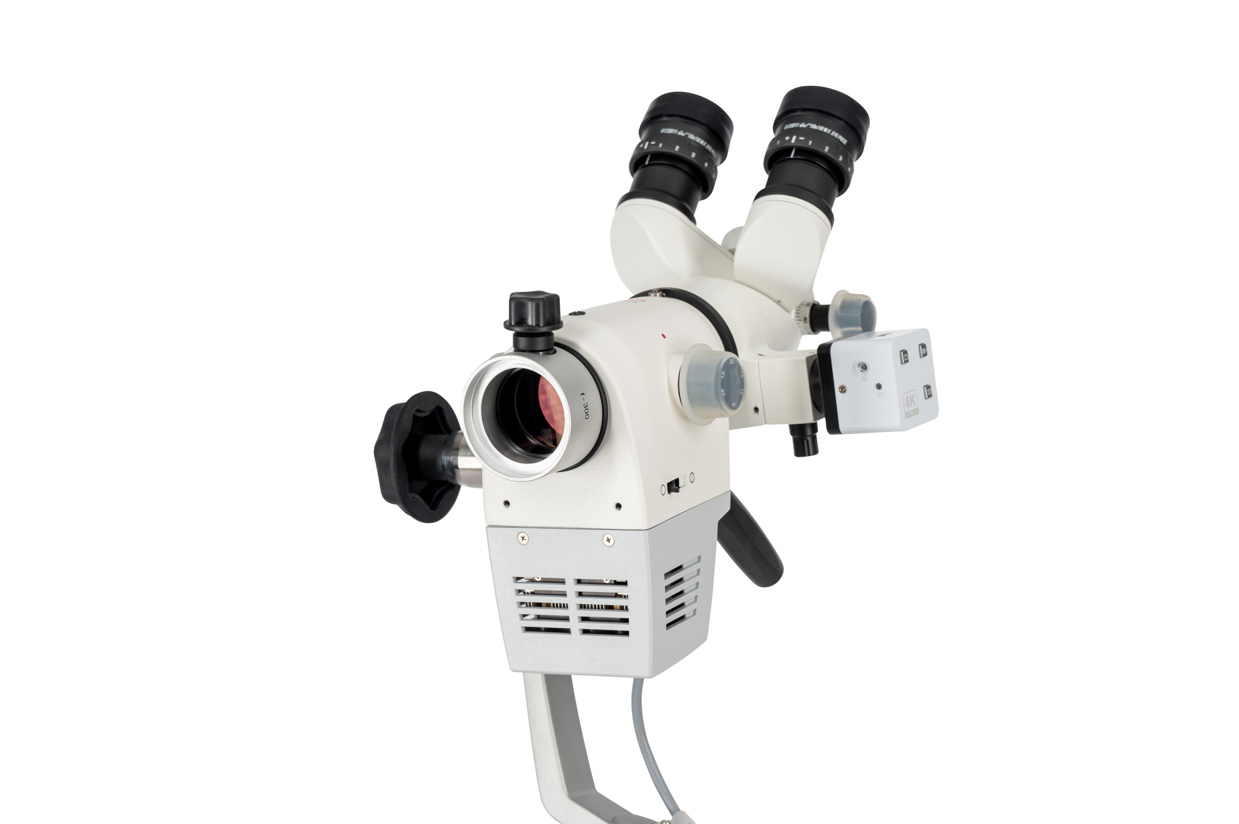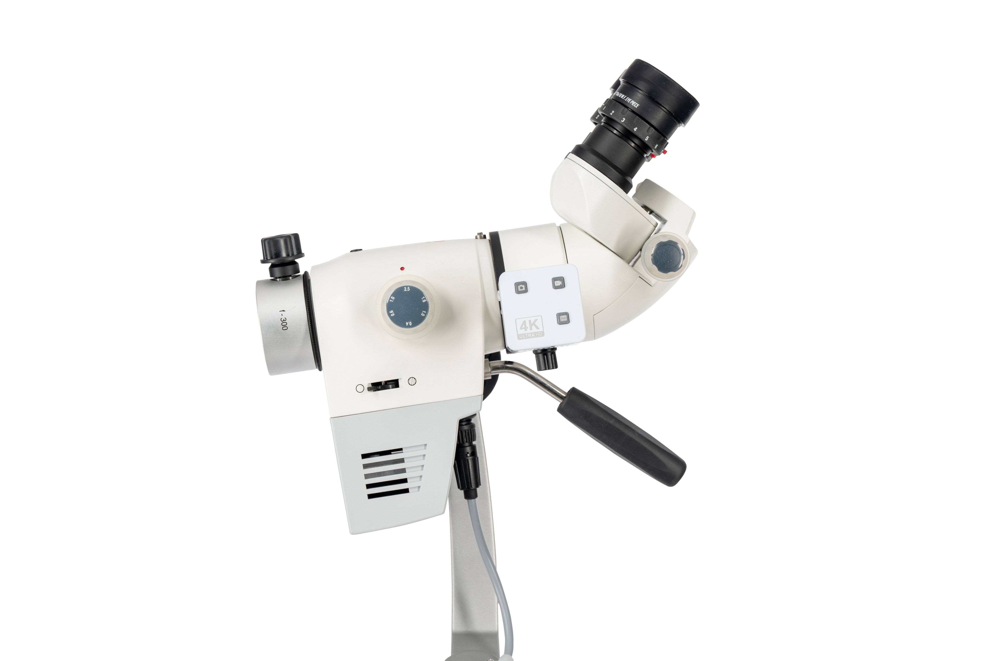 Апохроматическая оптическая система с пятиступенчатым увеличением. Ручки управления слева и справа на оптической голове. Защищены автоклавируемыми колпачками.