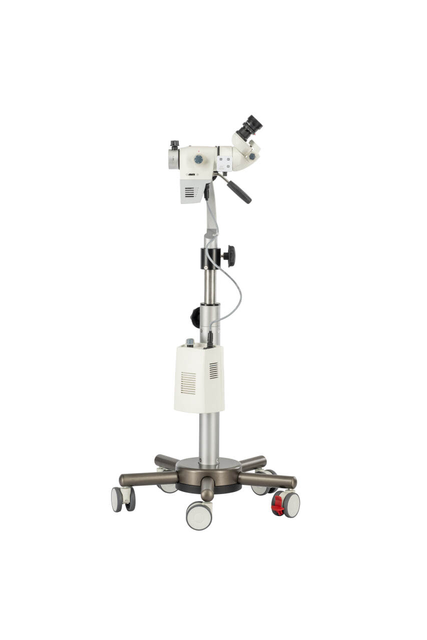 Прямой штатив не занимает много места и удобен при использование в небольших кабинетах. Возможность регулировки высоты оптической головы позволяет подстраивать ее на необходимую высоту для комфортной работы врача.
