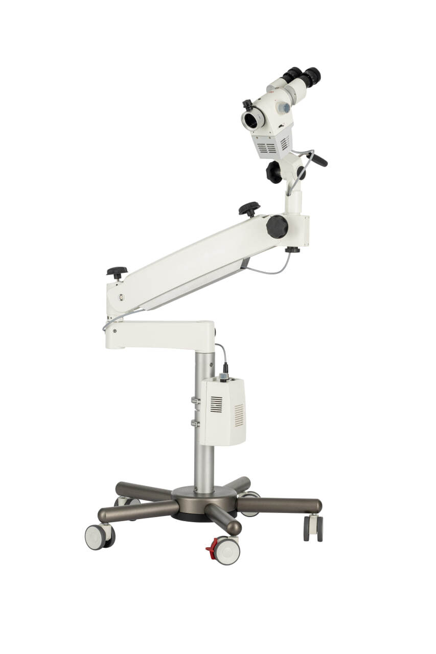 Российский кольпоскоп Прима К от производителя ООО “МедПрибор” с бинокулярным тубусом 90°, на консольном штативе.