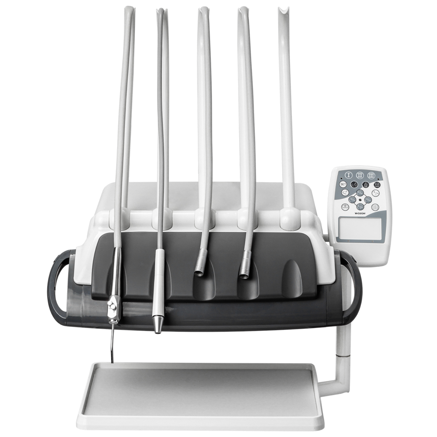 Верхняя подача инструментов пользуется большой популярностью у стоматологов. Это объясняется тем, что инструменты расположены так, что до них легко дотянуться, без необходимости поворачиваться. Соединительные шлангом контролируются надежной пружиной, которая не даст им упасть и повредиться. Блок врача установки рассчитан на 5 инструментов.